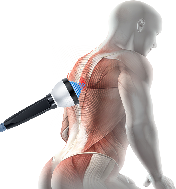 Während Sie die Stoßwellen mit unserem radialen oder fokussierten Gerät auf den schmerzenden Bereich übertragen, wenden Sie den Applikator fest auf den schmerzhaften Bereich auf der Haut an.
