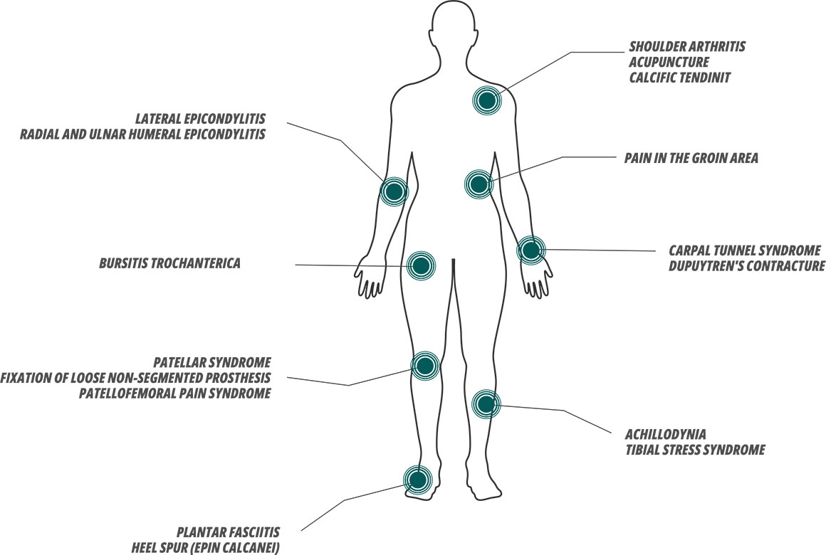 Die Methode der Anwendung der Therapie mit Schockwellen, die von außerhalb des Körpers gegeben werden, ist eine häufig bevorzugte Methode in den Bereichen der Veterinärmedizin, Neurologie, Urologie, Kardiologie, Sportmedizin, Dermatologie und Ästhetik, insbesondere in den Bereichen Orthopädie und Physiotherapie.